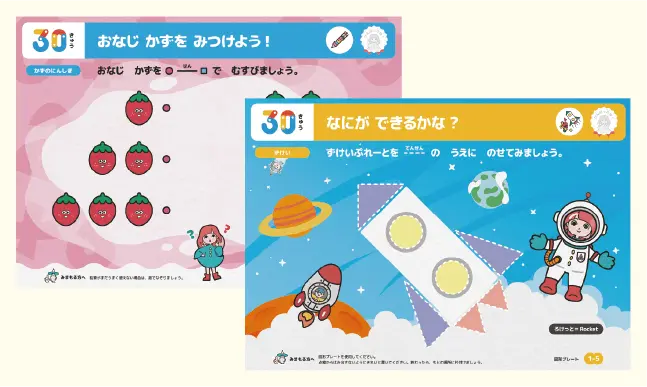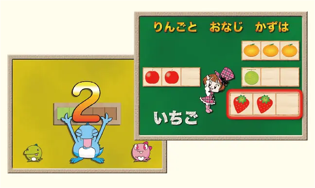 リズムに乗って学べる学習映像は、みんなで楽しくゲーム感覚で。仲間たちと一緒に、学びの習慣を身につけます。また数量感覚・空間把握能力など、リズム感も合わせてトレーニングができます。